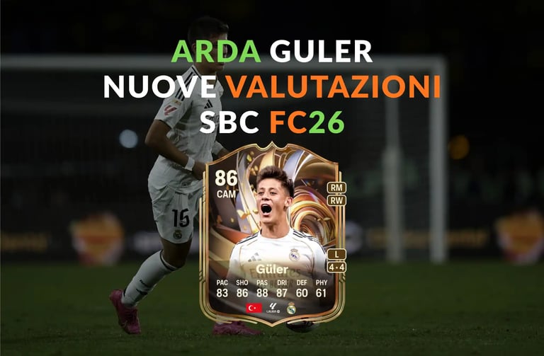 La stagione di EA SPORTS FC26 Ultimate Team continua a regalarci contenuti a ripetizione, e con l’arrivo delle nuove promo, ogni giorno può essere quello giusto per trovare un’occasione da non lasciarsi sfuggire. Stavolta è il turno di un giocatore speciale, protagonista sul campo e ora anche nei menù, grazie a una SBC dedicata che promette di infiammare la community. EA ascolta sempre di più i feedback dei fan e punta forte su carte su misura, bilanciate e pensate per integrarsi perfettamente nel meta attuale. E questa nuova carta sembra proprio progettata per offrire playstyles incisivi, statistiche solide e una versatilità tattica molto interessante per le prossime settimane di Weekend League, Rivals, e anche delle nuove modalità introdotte quest’anno. Inoltre, l’accessibilità della sfida la rende appetibile non solo ai player con rose top, ma anche a chi sta ancora costruendo il proprio club e cerca un’alternativa valida da far crescere nel tempo — magari anche grazie alle evoluzioni, sempre più centrali nella gestione del team su FC26. Stiamo parlando di Arda Guler Nuove Valutazioni arrivato venerdì 10/10 con la nuova promo e che resterà disponibile fino al 17/10. Più in basso scoprirai tutto in merito a questa SBC, ma prima devo ricordarti quanto sia importante la compravendita. Considerando soprattutto la riduzione della power curve avere a disposizione i crediti per comprarti qualsiasi giocatore o completare qualsiasi SBC può fare la differenza nel tuo Ultimate Team. Puoi fare tutto ciò con la CONSULENZA DEL PROFESSORE DI FUT, con questo percorso avrai il numero di telefono del Prof. e lui ti dirà giorno per giorno i nomi dei migliori giocatori da acquistare per moltiplicare i tuoi crediti su FC.
