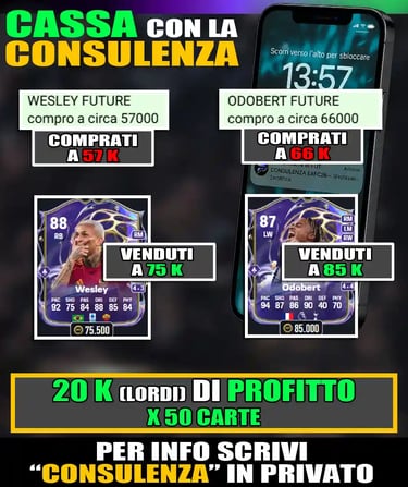 Però prima devo ricordarti che se vuoi avere sempre i tuoi crediti pronti per acquistare qualsiasi giocatore tu voglia sul mercato o completare tutte le SBC migliori, conosco un modo che fa al caso tuo. Con la CONSULENZA DEL PROFESSORE DI FUT potrai fare tutto ciò. Avrai inoltre a disposizione il numero di telefono del Prof. che quotidianamente manderà aggiornamenti sui migliori giocatori da acquistare per fare milioni di crediti.