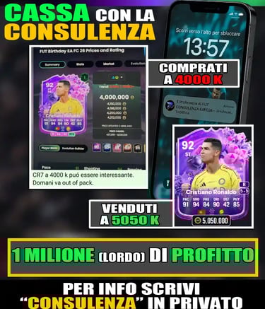 Le evoluzioni sono sempre molto interessanti e sotto vedremo quali sono i giocatori migliori da inserire in questa evo, ma ovviamente non puoi costruire una squadra solo con le evoluzioni. Hai bisogno di top player per essere competitivo. Ricorda che se vuoi mettere in squadra le carte più forti del gioco, c’è un modo facile per farlo. Con la CONSULENZA del PROFESSORE DI FUT hai il suo numero di telefono e ogni giorno ricevi i nomi, i filtri e i prezzi delle migliori carte da comprare per fare tanti tanti milioni su FC26.
