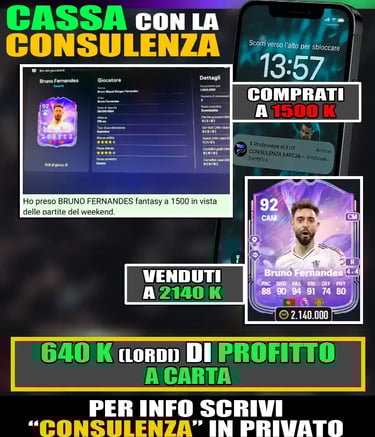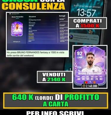 Voglio inoltre ricordarti che per avere i crediti per completare qualsiasi SBC che esce o comprare i top player per la tua rosa, allora sei nel posto giusto. Con la CONSULENZA DEL PROFESSORE DI FUT sarai in grado di sfruttare la compravendita per fare milioni di crediti. Con questo percorso avrai a disposizione il numero di telefono del Prof. e riceverai ogni giorno i nomi dei migliori giocatori da acquistare per triplicare i tuoi profitti.