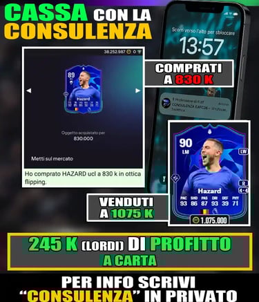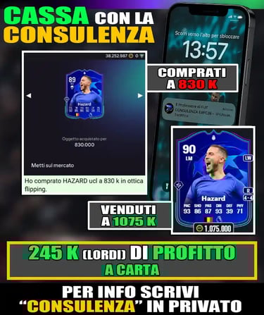 PerΓ² prima devo ricordarti che se vuoi avere sempre i tuoi crediti pronti per acquistare qualsiasi giocatore tu voglia sul mercato o completare tutte le SBC migliori, conosco un modo che fa al caso tuo. Con la CONSULENZA DEL PROFESSORE DI FUT potrai fare tutto ciΓ². Avrai inoltre a disposizione il numero di telefono del Prof. che quotidianamente manderΓ aggiornamenti sui migliori giocatori da acquistare per fare milioni di crediti.