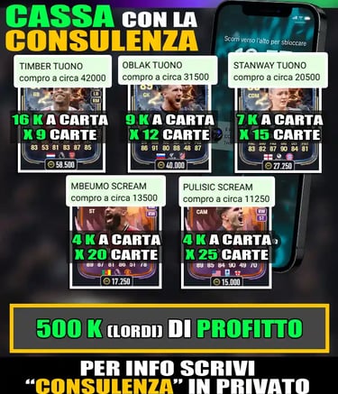 SBC giornaliere, contenuti Flash e missioni a tempo limitato. Vuoi le carte più forti di questa promo subito nella tua squadra? Puoi averle in modo facile. Grazie alla CONSULENZA DEL PROFESSORE DI FUT puoi fare tantissimi milioni di crediti e comprare le carte più forti del gioco.
