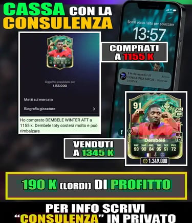 La SBC di Michael Olise Menzione d’Onore TOTY ha un costo di circa 565.000 crediti su console e 490.000 crediti su PC. È un prezzo importante, ma coerente con ciò che offre la carta: doppio PlayStyle+, statistiche di livello altissimo e una versatilità tattica rara. Se stai cercando un esterno francese capace di giocare anche in posizione centrale, Olise rappresenta una delle migliori opzioni disponibili durante i TOTY. Non è una SBC obbligatoria, ma è una scelta intelligente e solida per chi vuole investire su una carta longeva, senza dover inseguire a tutti i costi un TOTY dai pacchetti. Voglio comunque ricordarti che non puoi basare la tua squadra solo sulle SBC, devi metterci dentro i top player. Puoi fare questo con la CONSULENZA DEL PROFESSORE DI FUT. Con questo percorso potrai triplicare i tuoi crediti così da poterti permettere qualsiasi giocatore tu voglia.