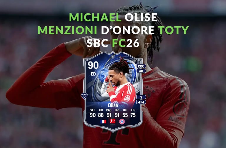 Nel periodo più caldo dell’anno su EA SPORTS FC26 Ultimate Team, mentre l’attenzione della community è completamente focalizzata sui TOTY, EA Sports sorprende tutti con l’uscita di una SBC Menzione d’Onore TOTY dedicata a Michael Olise. Non si tratta del rilascio del team completo delle Menzioni d’Onore, ma di un contenuto singolo, pensato per offrire fin da subito un’alternativa di altissimo livello a chi non è riuscito – o non riuscirà – a mettere le mani su un TOTY dai pacchetti. Michael Olise è uno di quei giocatori che su FUT incarnano perfettamente il concetto di calciatore moderno: tecnico, intelligente, capace di giocare in più zone del campo e soprattutto costruito attorno ai PlayStyles giusti per il meta attuale di FC26. Questa versione Menzione d’Onore TOTY nasce con un obiettivo preciso: offrire una carta top-tier durante l’evento più importante dell’anno, senza dover dipendere esclusivamente dalla fortuna nei pacchetti. Il timing di questa SBC non è casuale. Siamo nel cuore dei TOTY, un periodo in cui il mercato è instabile, i prezzi oscillano e le SBC diventano sempre più costose. In questo contesto, una carta come Olise Menzione d’Onore rappresenta una scelta concreta e ragionata, soprattutto per chi cerca un giocatore offensivo estremamente versatile, capace di fare la differenza sia sugli esterni che in posizione centrale. Però prima devo ricordarti che se vuoi avere sempre i tuoi crediti pronti per acquistare qualsiasi giocatore tu voglia sul mercato o completare tutte le SBC migliori, conosco un modo che fa al caso tuo. Con la CONSULENZA DEL PROFESSORE DI FUT potrai fare tutto ciò. Avrai inoltre a disposizione il numero di telefono del Prof. che quotidianamente manderà aggiornamenti sui migliori giocatori da acquistare per fare milioni di crediti.