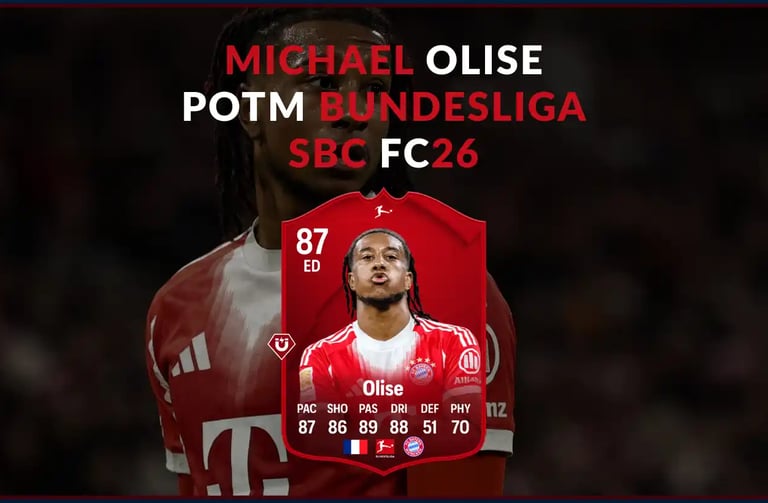 La scena competitiva di EA SPORTS FC 26 Ultimate Team continua a riservare sorprese anche sul fronte dei giocatori POTM (Player of the Month), premiando i migliori calciatori dei campionati piΓΉ prestigiosi. Per il mese di novembre, la Bundesliga ci regala una carta estremamente interessante: Michael Olise, talento del Crystal Palace recentemente trasferitosi nella lega tedesca, riceve una SBC dedicata con statistiche potenziate e una versatilitΓ che lo rende utile in piΓΉ zone del campo. Con lβarrivo di dicembre e con il Black Friday alle spalle, molti giocatori stanno riorganizzando le proprie rose, sfruttando SBC economiche e carte di qualitΓ per migliorare lβintesa e aggiungere profonditΓ alla propria panchina. La carta POTM di Olise si inserisce perfettamente in questo contesto: prezzo accessibile, ottime stats offensive, e una grande varietΓ di ruoli e incarichi, che la rendono particolarmente appetibile per chi cerca un COC creativo o un esterno tecnico con ottime doti di rifinitura. La SBC Michael Olise POTM Γ¨ disponibile su FC 26 dal giorno 8 dicembre 2025, e si presenta come una delle sfide piΓΉ bilanciate in termini di costo-prestazioni. Inoltre, con la Bundesliga che offre moltissimi giocatori evolvibili e ibridabili, completare questa sfida potrebbe essere un ottimo modo per potenziare il reparto offensivo senza investire cifre esorbitanti. Vediamo ora la review completa di questa carta. PerΓ² prima devo ricordarti che se vuoi avere sempre i tuoi crediti pronti per acquistare qualsiasi giocatore tu voglia sul mercato o completare tutte le SBC migliori, conosco un modo che fa al caso tuo. Con la CONSULENZA DEL PROFESSORE DI FUT potrai fare tutto ciΓ². Avrai inoltre a disposizione il numero di telefono del Prof. che quotidianamente manderΓ aggiornamenti sui migliori giocatori da acquistare per fare milioni di crediti.