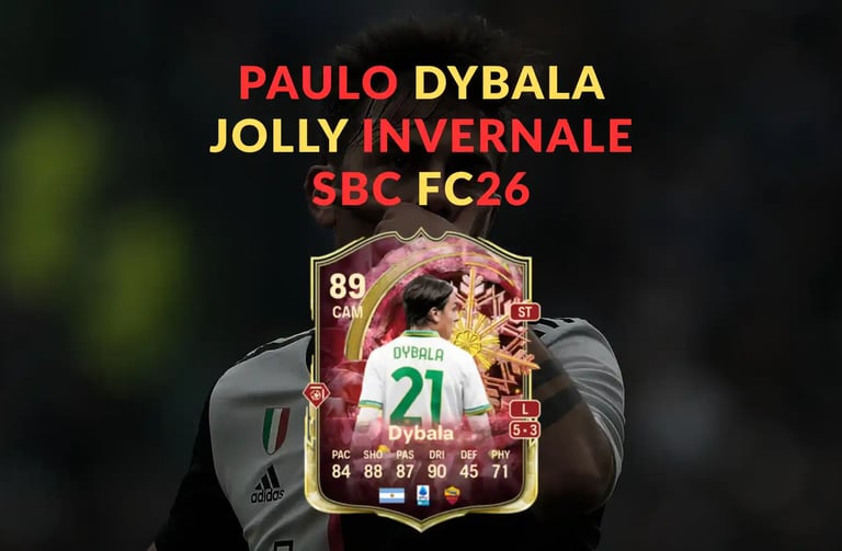 Il periodo natalizio su FC 26 Ultimate Team Γ¨ ufficialmente iniziato, e con esso anche la tanto attesa promo Jolly Invernali (Winter Wildcards). Una delle campagne piΓΉ amate e imprevedibili dellβanno, che ogni giorno sorprende i giocatori con SBC nuove, sfide Flash, evoluzioni speciali e carte super potenziate. In un clima di fermento assoluto, EA Sports ha deciso di rilasciare una delle carte piΓΉ intriganti di questa fase iniziale della promo: Paulo Dybala Jolly Invernali, disponibile ora tramite Sfida Creazione Rosa. La carta di Paulo Dybala Γ¨ da anni sinonimo di qualitΓ , eleganza e fantasia in campo, e la versione βJollyβ non fa eccezione. Arricchita da playstyles meta, ruoli multipli e statistiche raffinate, questa versione si propone come una delle piΓΉ complete a disposizione nel ruolo di COC o seconda punta. L'argentino della Roma Γ¨ una delle icone della Serie A su Ultimate Team e in questa nuova veste promette di essere letale tra le linee, offrendo soluzioni creative e tecniche che ben si adattano al meta attuale. In un periodo denso di contenuti e con tantissime SBC attive, Γ¨ importante valutare bene ogni carta disponibile. Proprio per questo, in questo articolo analizzeremo nel dettaglio tutto ciΓ² che c'Γ¨ da sapere su Dybala Jolly Invernali: le statistiche, i playstyles, le posizioni, il costo della sfida, i pro e contro e, ovviamente, se vale davvero la pena completarla. Se stai cercando un trequartista completo, tecnico e creativo per il tuo team, continua a leggere: questa SBC potrebbe essere perfetta per te. Vale davvero la pena completare questa sfida o Γ¨ meglio conservare risorse? Scopriamolo nel dettaglio. PerΓ² prima devo ricordarti che se vuoi avere sempre i tuoi crediti pronti per acquistare qualsiasi giocatore tu voglia sul mercato o completare tutte le SBC migliori, conosco un modo che fa al caso tuo. Con la CONSULENZA DEL PROFESSORE DI FUT potrai fare tutto ciΓ². Avrai inoltre a disposizione il numero di telefono del Prof. che quotidianamente manderΓ aggiornamenti sui migliori giocatori da acquistare per fare milioni di crediti.